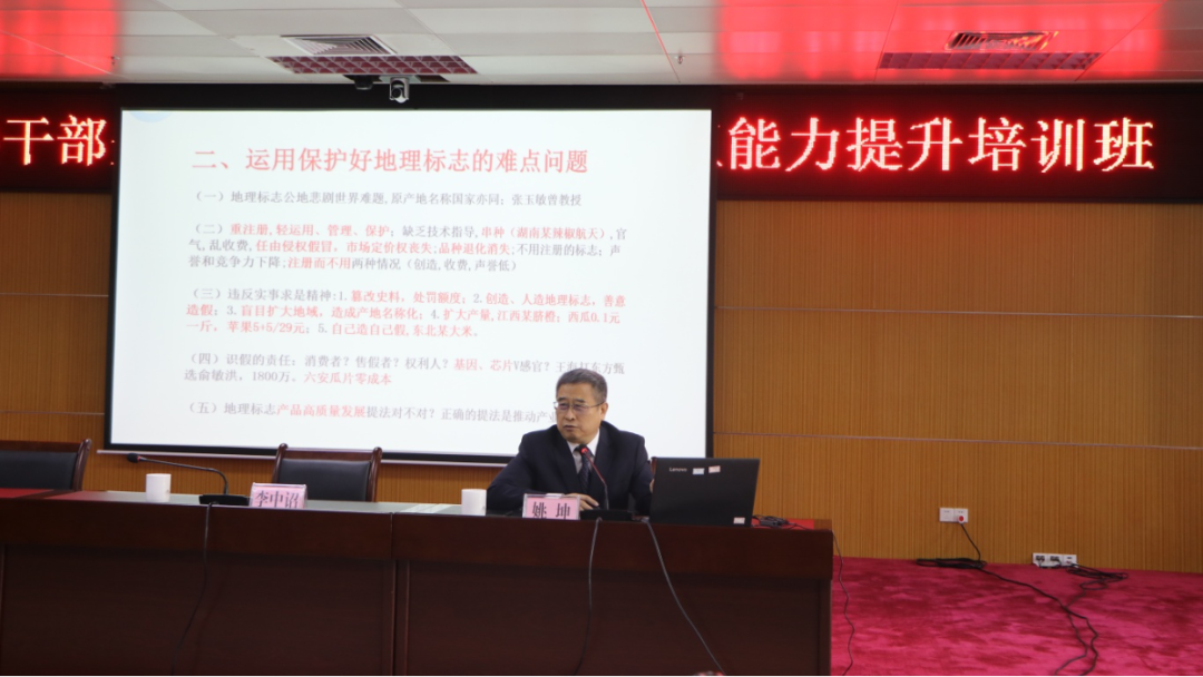 培训班邀请了国家知识产权局商标局原一级巡视员姚坤作了《运用地理标志商标促进区域经济绿色发展》专题授课。姚坤讲解了地理标志商标的概念、特征、种类和意义,并结合国内外地理标志案例,重点讲解了地理标志商标在促进区域经济绿色发展中的重要作用,指出地理标志商标不仅是知识产权保护的一部分,更是连接农业生产与市场的重要桥梁,对于提升农产品附加值、市场竞争力、增加农民收入、推动农业产业结构调整意义重大,姚坤还结合英德红茶产业发展实际情况就加强地理标志商标的保护和地理标志产业发展提出了自我管理、行政保护、拉长产业链、发展地标文化等对策。
